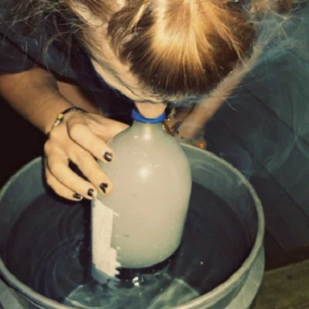 4. שואפים את העשן שנכלא בבקבוק, ותוך כדי מורידים באיטיות את הבקבוק בחזרה למטה.