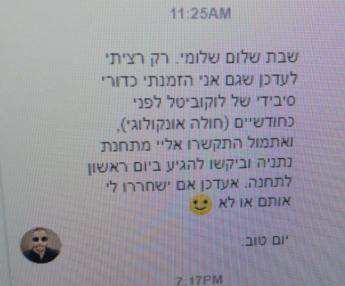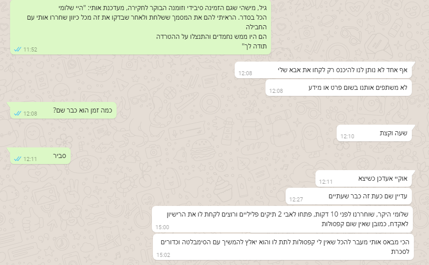 “הי שלומי, הכל בסדר”, עדכן אותי גיל: “לאחר שהראתי להם (משטרת תלפיות – ירושלים) את המסמך ששלחת ולאחר שבדקו את זה מכל כיוון שחררו אותי עם החבילה. הם היו ממש נחמדים והתנצלו על ההטרדה”.