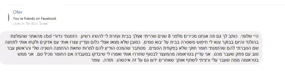 “הזמנתי כדורי CBD… היום בבוקר עשו לי חיפוש משטרה בבית על יבוא סמים. כמובן שלא מצאו אצלי כלום ועדיין עצרו אותי עם אזיקים ולקחו אותי לתחנה… אני עדיין בטראומה מהמעצר, לבסוף שחררו אותי ואמרו לי שיבדקו במעבדה אם החומר מכיל סם. אני ממש בטראומה ממה שעבר עלי…”
